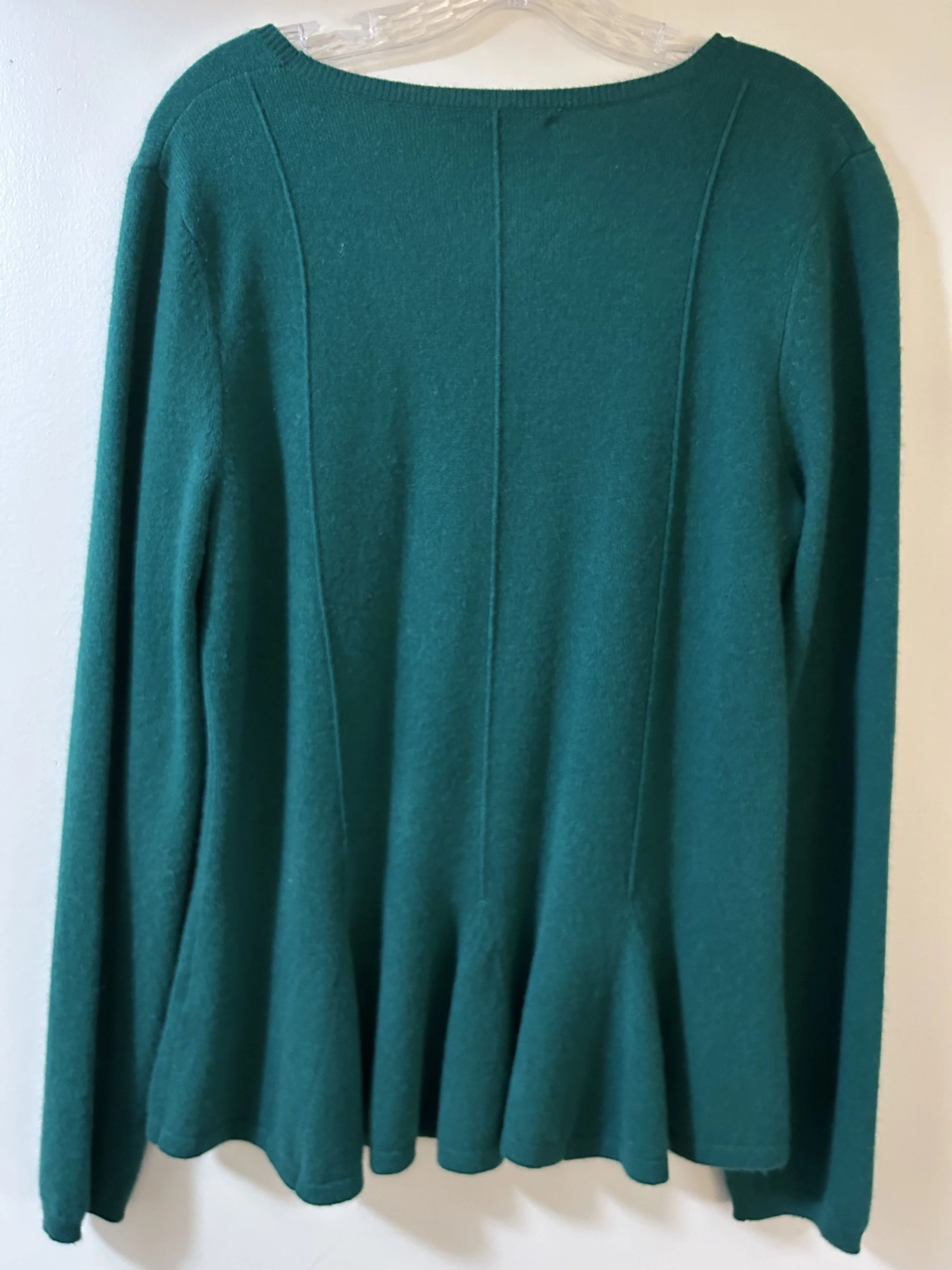 Antonio Melani cashmere sweater in Kelly green. This lovely sweater is a size large and has a peplum style. It has long sleeves and a scoop neckline. This sweater has never been worn. The photographs do not show a true representation of the shade of green. The actual color is a true Kelly green and not the blueish green depicted in the photos. This item has never been worn.