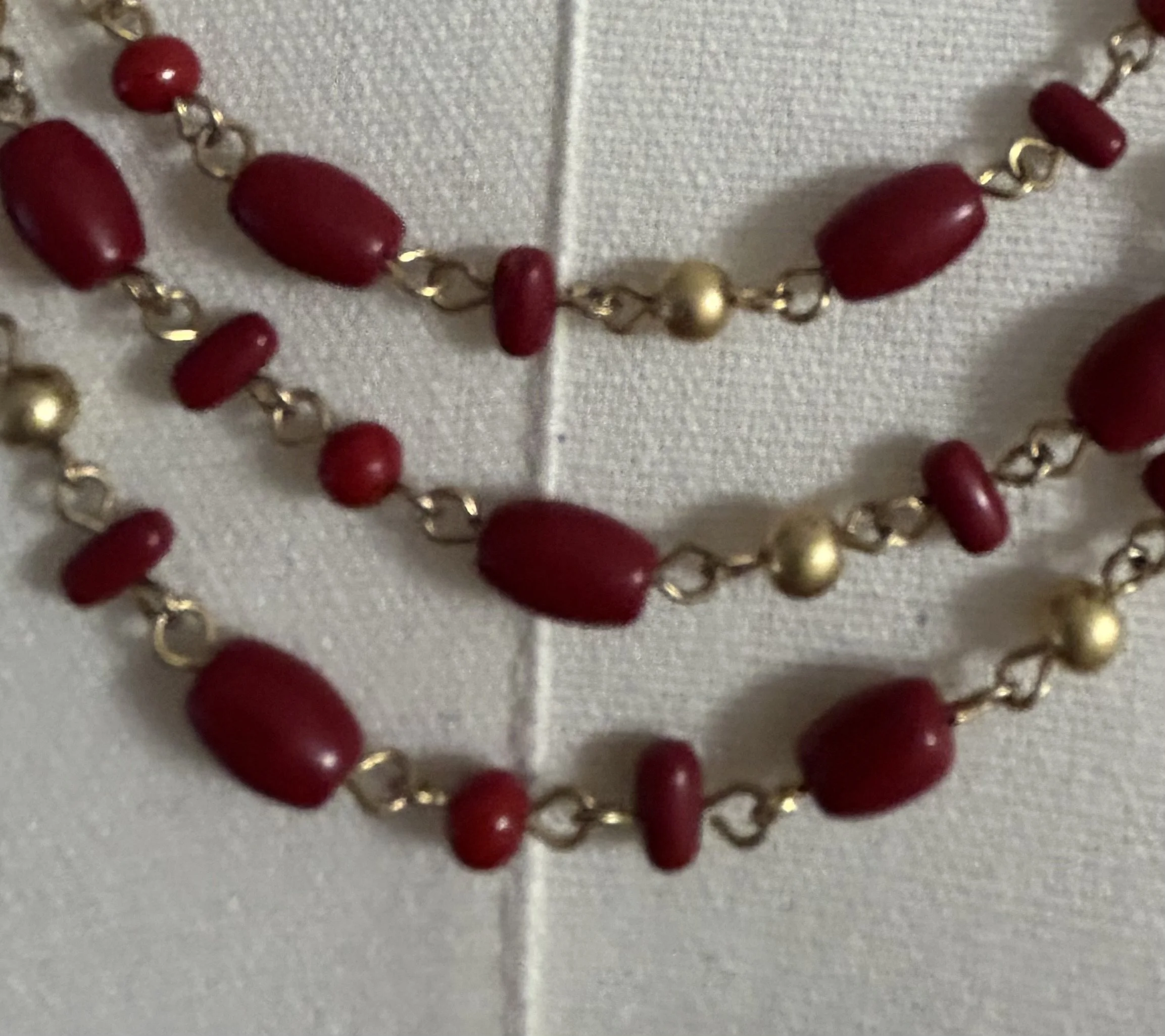 This triple strand beaded necklace is 11" in length. The majority of the beads are dark red with tiny gold beads interspersed through out the necklace.
